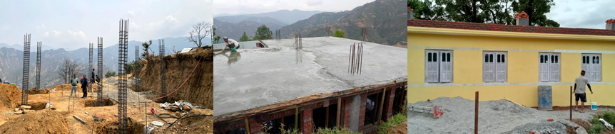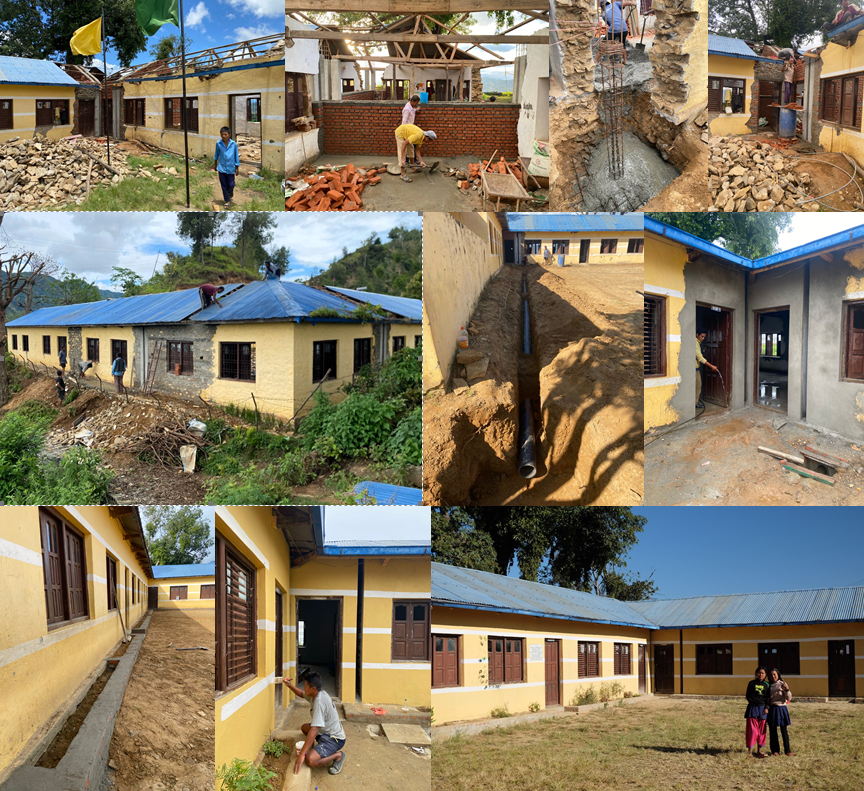 Shree Bhumestan Higher Secondary School: Das Projekt „Reparatur Schulgebäude in Lurpung“ konnte erfolgreich abgeschlossen werden. Der Mittel-/Eckteil des L-förmigen Gebäudes hatte sich beim starken Erdbeben 2015 etwas nach außen / Hangabwärts bewegt, weil sich das Fundament gesetzt hatte. Zu Beginn waren nur dünne Risse sichtbar, der Boden der Klassenräume wurde uneben. Seit mehreren Jahren bewegten sich die beiden betroffenen Räume weiter nach außen, eine aufwändige und massive Hangsicherung wurde vor einigen Jahren errichtet, um das Abrutschen zu verhindern. Bei der Starkregenkatastrophe im Okt. 2024 weichte der Hang jedoch stark auf, so dass der Gebäudeteil weiter absackte und die Wände sowie der Boden große Risse aufwiesen. Diese beiden Räume sowie angrenzende Gebäudeteile waren nicht mehr nutzbar und einsturzgefährdet. Im Sommer 2025 wurde nun das gesamte Gebäude renoviert. Das L-förmige Gebäude, das 6 Klassenräume umfasst, wurde in 3 inzelne Gebäudeteile mit jeweils zwei Klassenräumen aufgeteilt. Der defekte Mittelteil wurde abgerissen, ein neues Beton-Fundament mit Stahlarmierung hergestellt, die Wände mit Stahlbetonstützen neu errichtet. Nachhaltiger Aspekt und Kostenersparnis wurden durch die Wiederverwendung der Holzfenster, der Holztüren und des hölzernen Dachstuhls erreicht. Am Ende wurde der ganze L-förmige Gebäudekomplex mit einem durchgehenden Blechdach neu eingedeckt und mit neuen Regenrinnen ausgestattet. Der ganze Schulhof wurde abgegraben und ist nun niedriger, um bei stehendem Regenwasser während der Monsun-Zeit eine Überschwemmung der Schulräume zu vermeiden. Eine komplette Einfassung des Gebäudes mit Treppenstufen wurde errichtet, die Zwischenräume wurden aufgefüllt und bepflanzt. Auf dem gesamten Innenhof wurde unterirdisch eine großdimensionierte Regenwasser Abflussdrainage installiert, um das Wasser aus den Rinnen und das stehende Regenwasser abfließen zu lassen und eine Durchweichung des Untergrundes zu vermeiden. So können in Zukunft die Fundamente des Schulgebäudes nicht mehr durchnässen. Der ganze Gebäudekomplex ist nun nach den neuesten Bauregeln für Schulen errichtet worden und gleichzeitig Erdbebensicher ertüchtigt worden. Nun können die Schulkinder wieder am kostenlosen, von uns organisierten Unterricht teilnehmen, und die Dorfbewohner erhielten durch die Renovierung einen Job, der ihnen ein gewisses Einkommen ermöglichte.